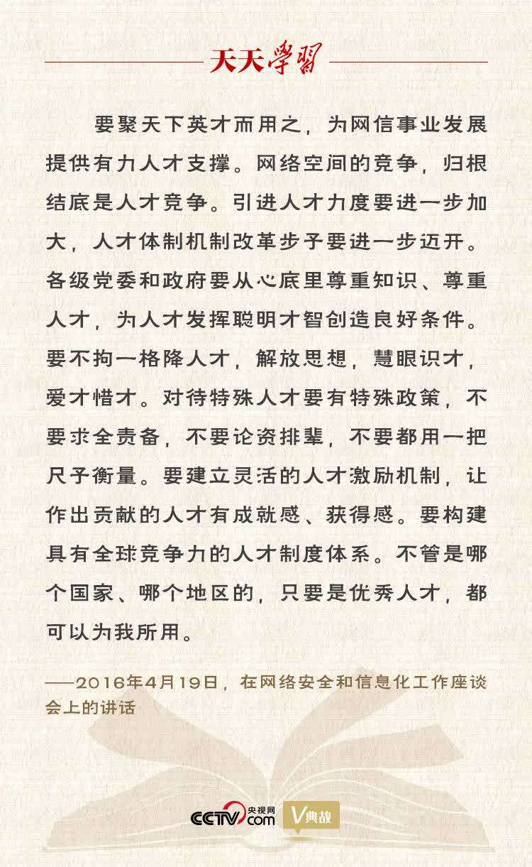 “引进人才力度要进一步加大,人才体制机制改革步子要进一步迈开。网信领域可以先行先试,抓紧调研,制定吸引人才、培养人才、留住人才的办法。” “在人才选拔上要有全球视野,下大气力引进高端人才……不管是哪个国家、哪个地区的,只要是优秀人才,都可以为我所用。”