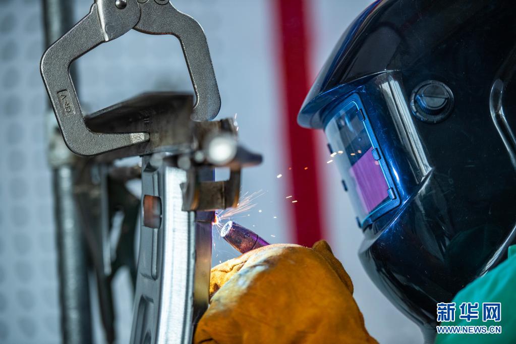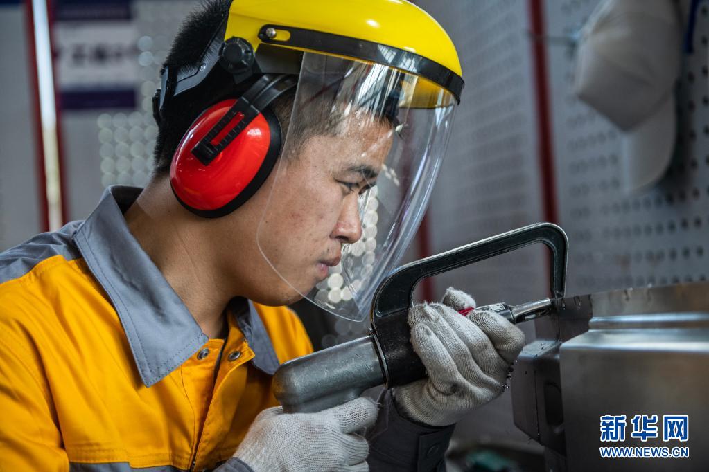 4月22日,参赛选手在车身修理——板件更换项目比赛中。