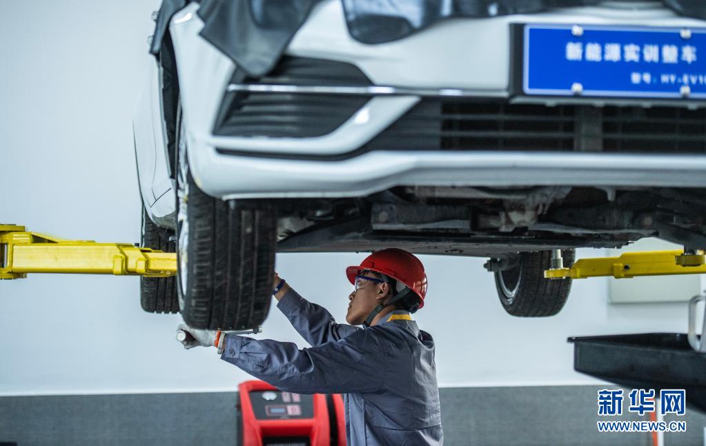 4月22日,参赛选手在新能源汽车检测与维修项目比赛中。