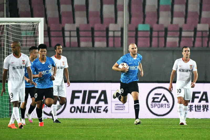 4月22日,大连人队球员丹尼尔森(右二)在比赛中庆祝进球。新华社发(史康摄)