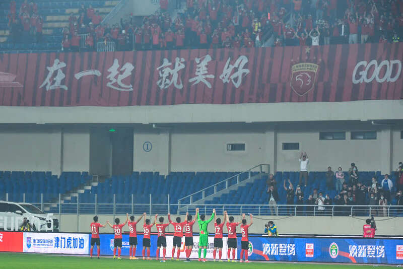 4月22日,上海海港队球员赛后向球迷致意。新华社记者 李博 摄