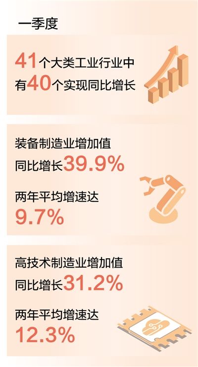 复苏面不断扩大。一季度,41个大类工业行业中有40个实现同比增长。
