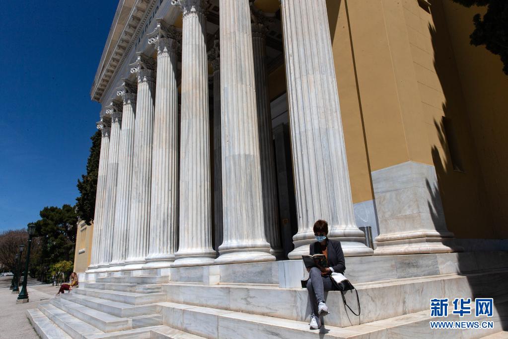 4月22日,一名女子坐在希腊雅典扎皮翁宫前阅读。