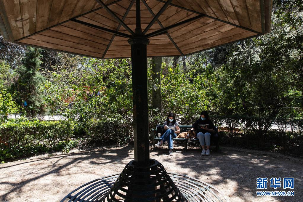4月22日,两名女子在希腊雅典一处公园的长椅上阅读。