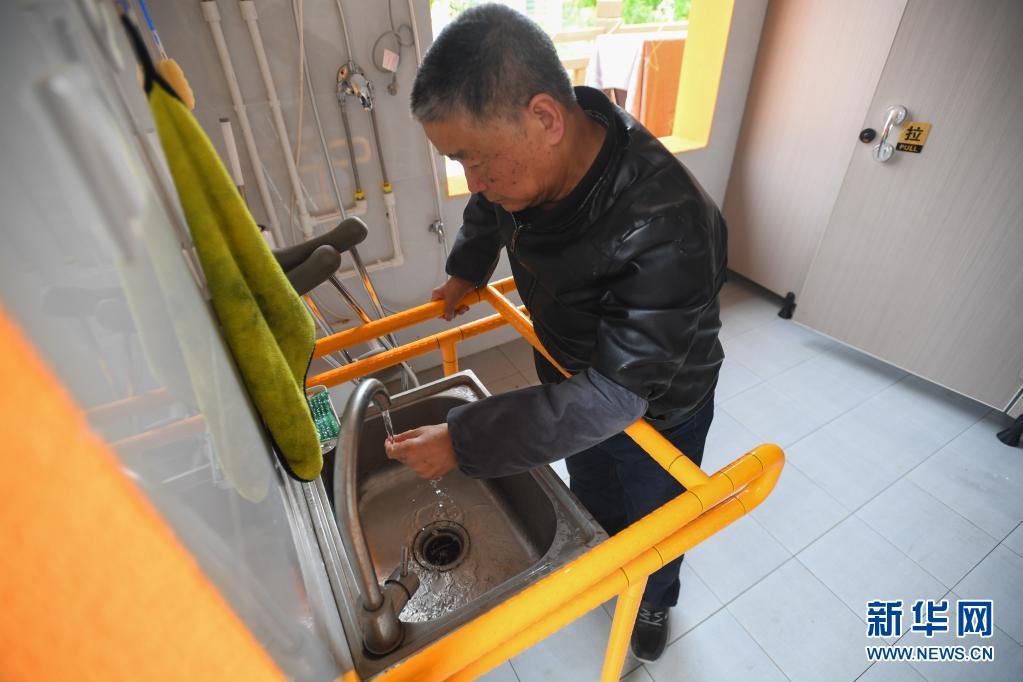 4月23日,在湖南省长沙市天心区暮云街道暮云新村,村民在家中卫生间扶着新安装的扶手洗手。