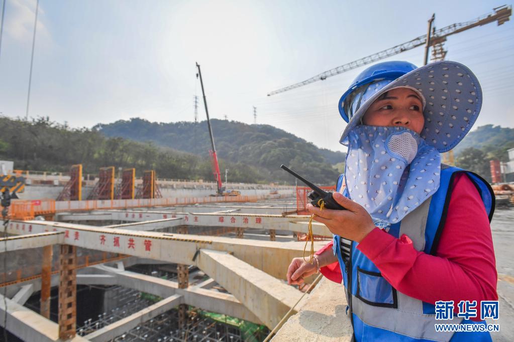 吊装协调员在广州地铁七号线二期水西北站施工现场指挥吊车装卸物料(4月23日摄)。
