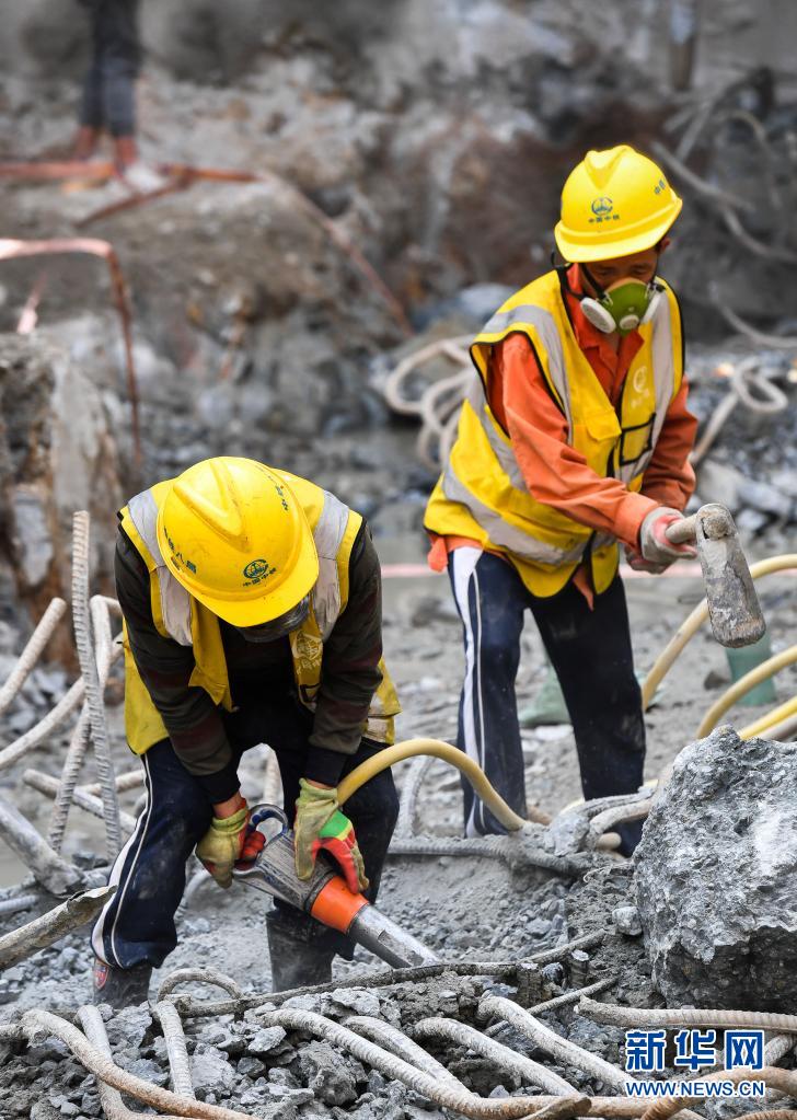 工人在广州地铁七号线二期水西北站施工(4月23日摄)。