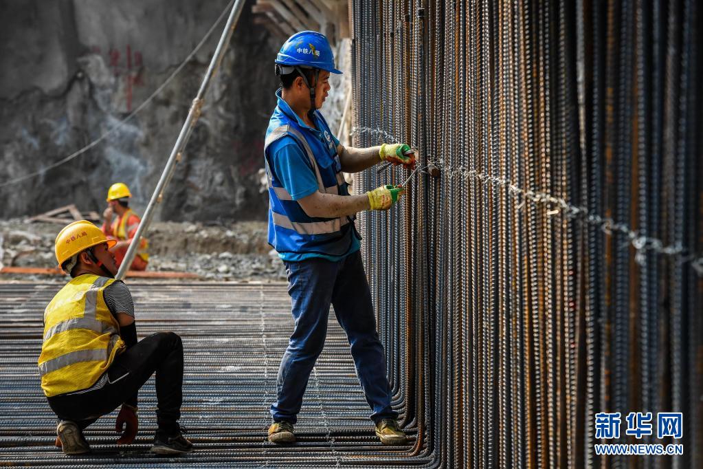 工人在广州地铁七号线二期水西北站施工现场绑扎钢筋(4月23日摄)。