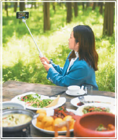 浙江省杭州市富阳区东洲街道举办“味道山乡·田园餐桌”云直播活动,用云直播、云旅游的方式让网友感受山乡味道。图为工作人员在田园餐桌品尝山乡美食,并通过手机直播平台进行“云直播”。
