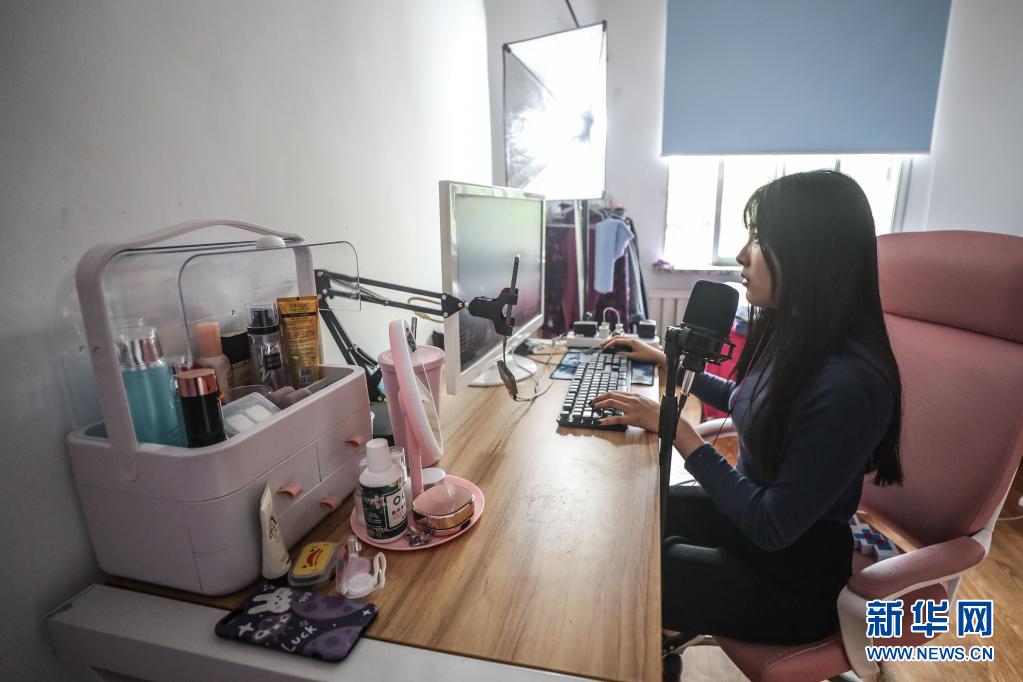 辽宁省营口市老边区网红直播基地一家公司的网络主播在进行直播(2020年6月2日摄)。