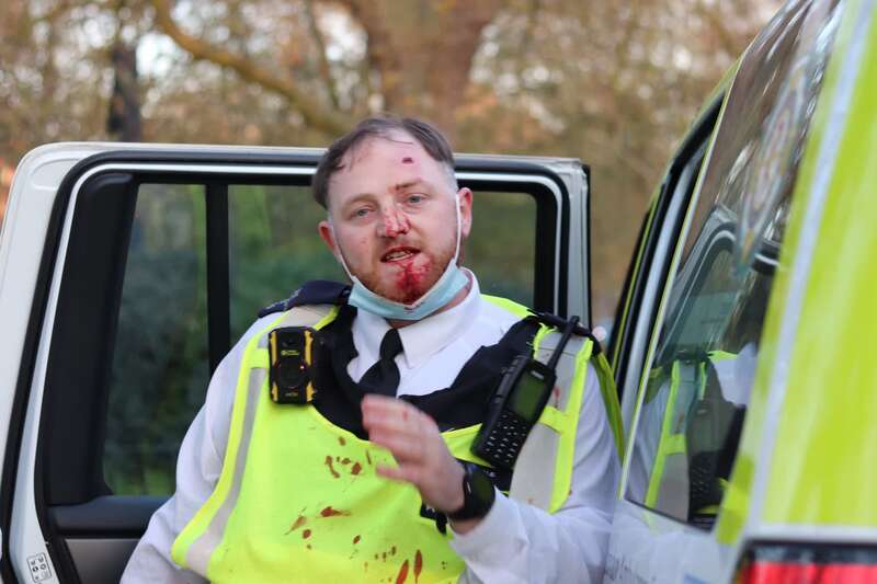 现场照片显示,一名男警员头被打破,鲜血流了满脸,另一名女警官也头部受伤。还有一名受伤警察鼻子出血,血流到他身上的荧光背心上,十分显眼。一位官方发言人表示:“8名警官今天在疏散海德公园人群时受伤。”据悉,两名警察被送往医院,但没有受到致命伤害。三人因涉嫌殴打警察被捕。