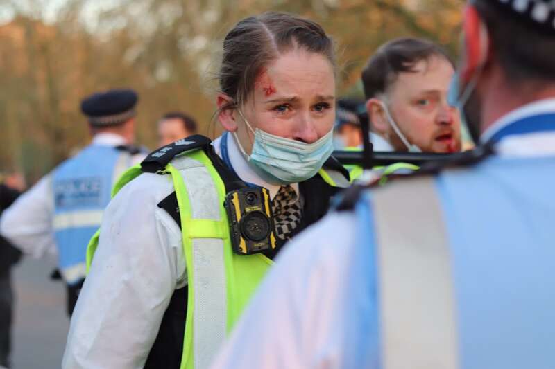 海外网4月25日电 据英国《镜报》24日消息,英国伦敦日前一场反对封锁的抗议游行转变为暴力冲突。多名警察在和抗议者扭打时受伤,头破血流。