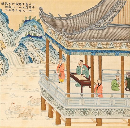 乾隆为打造 “兰亭文化工程”付出巨大精力。他一生创作了10首“兰亭”御制诗,69岁在圆明园刻制“兰亭八柱”并在宁寿宫花园建禊赏亭,70岁以内府收藏的明代藩王所刻端石《兰亭图》为底本“补刻兰亭图端石”,85岁左右织造本卷“兰亭图帖缂丝全卷”,凭此巅峰之作,乾隆的“兰亭文化工程”圆满收官。