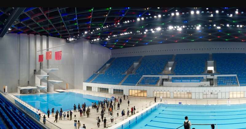 大跨度的型钢混凝土结构,参照水波浪形态设计,和地面的波浪拼花造型………整个场馆外观结构全部采用富春山水灵动弧线,特别是观光式屋顶花园将成为全省甚至全国的示范作品,融入的运动休闲、时代文化元素,让市民惊叹。考虑到水上比赛项目观众无法定点全程观看比赛,场馆为此配置了VR系统便于观赛。