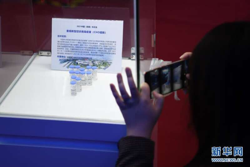 4月26日,在中国(安徽)科技创新成果转化交易会上,观众在拍摄安徽智飞龙科马生物制药有限公司展出的展品。