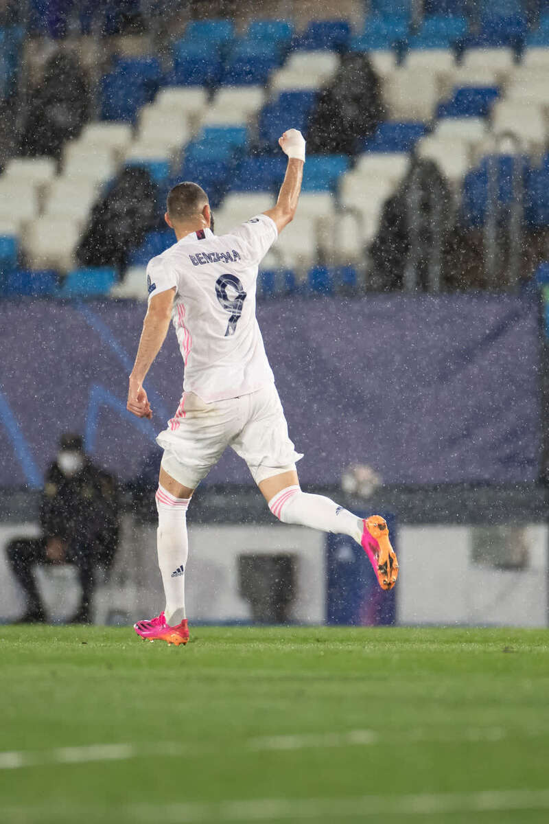 4月27日,皇家马德里队球员本泽马在比赛中庆祝进球。新华社记者孟鼎博摄