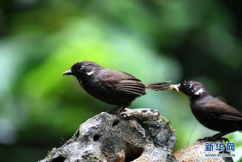 在广西龙州县逐卜乡弄岗村陇亨屯村民农伟宏的观鸟点,两只弄岗穗鹛在觅食(2018年3月29日摄)。新华社记者 周华 摄