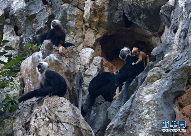 在广西崇左白头叶猴国家级自然保护区板利片区一处山坳里,几只白头叶猴准备走出“家门”觅食(2016年8月6日摄)。新华社记者 周华 摄
