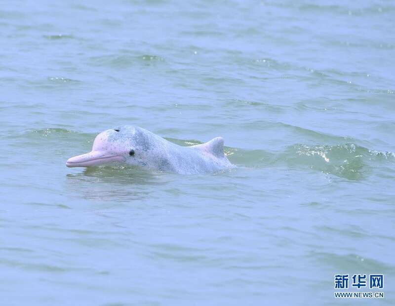 在广西钦州市三娘湾海域,一头野生中华白海豚在自由嬉戏(2018年6月10日摄)。新华社记者 周华 摄