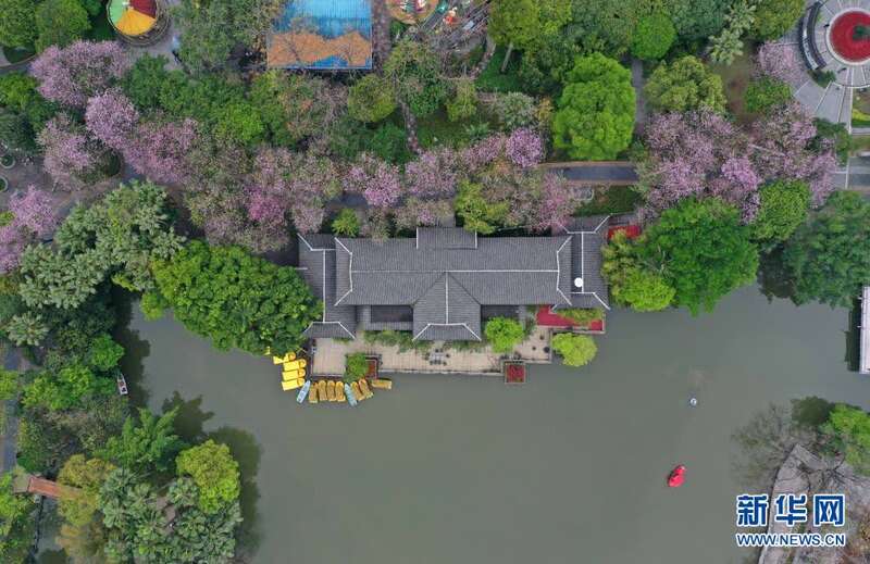 这是洋紫荆盛开的柳州市柳侯公园(无人机照片,2月28日摄)。新华社记者 黄孝邦 摄