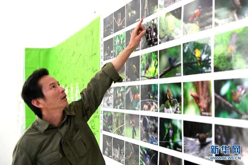 中越边境的广西龙州县逐卜乡弄岗村陇亨屯村民农伟宏指着挂在家里的鸟类图片,介绍各种鸟的叫声特点(3月29日摄)。新华社记者 周华 摄