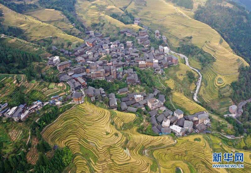 这是广西龙胜各族自治县龙脊梯田景观(无人机照片,2019年10月10日摄)。新华社记者 陆波岸 摄