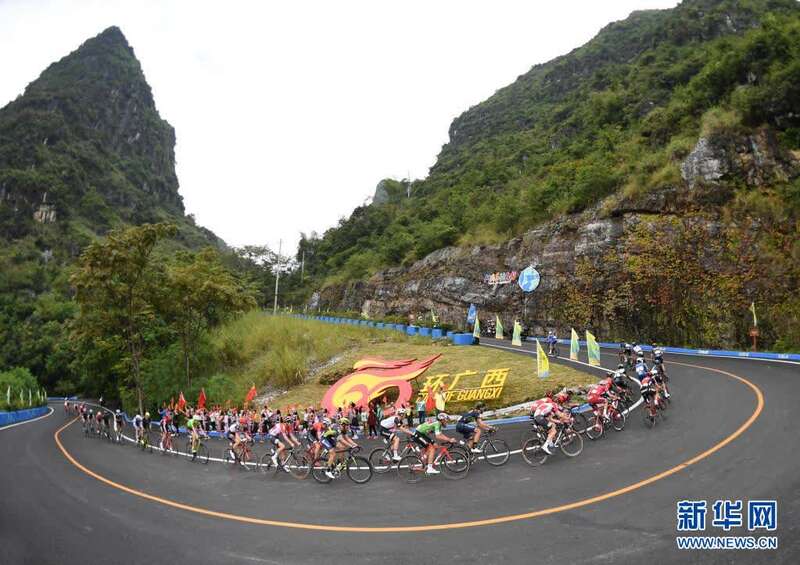 在环广西公路自行车世界巡回赛中,参赛选手经过弄拉路段(2017年10月22日摄)。新华社记者 陆波岸 摄