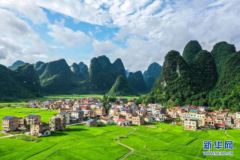 这是广西环江毛南族自治县大才乡重楼村夏日田园景色(2020年5月25日摄,无人机照片)。新华社记者 曹祎铭 摄
