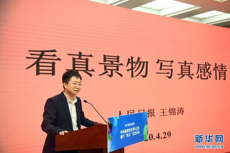 4月29日,人民日报社记者王锦涛在交流活动现场发言。