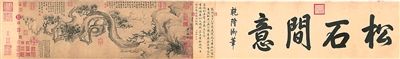 此卷《偃松图》上绘一巨松,从倾斜向左的三四块峭拔锋利的巨石间横向盘曲延展,状若游龙,在中间构成回旋的态势,与右侧岩石根部钻出的两丛竹子相呼应。画的后部是挺拔蜷曲的松枝收拢向上之姿。这件作品注录于《石渠宝笈初编》,列为“上等寒一”,并深受乾隆皇帝喜爱。他不仅在多处钤印,还题写了引首四字“松石间意”及三段跋文。