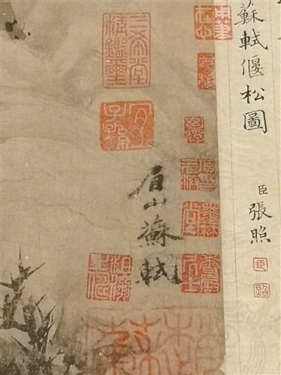 之所以认定是苏轼原作,除最具苏轼风格的盘松与顽石外,画心最右侧边缘中部有“眉山苏轼”的题款,下面还有一方朱文方印:赵郡苏氏。但这两处很成问题。首先,题款四字虽呈现出偏平与右倾的苏字典型特征,但笔画生硬,板滞,毫无苏字的弹性与宽厚感;其次,这方印章也来得蹊跷,不见于他处。书画史上所见的苏轼钤印极为稀少,寥寥可数的两三方,且都是孤例,无法比对。苏轼所在的北宋,至后期才开始少量地使用书画款印,且多集中于宋徽宗一人。至南宋,特别是元代,诗书画印的融合才得以进一步发展。本卷上可见乾隆皇帝著名的五玺:“乾隆鉴赏”“乾隆御览之宝”“石渠宝笈”“三希堂精鉴玺”“宜子孙”,此外还有晚明大收藏家项元汴近二十方印章,如“元汴之印”“墨林秘玩”“平生真赏”“子京珍藏”等朱文印和“项氏子京”“项元汴氏审定真迹”“项墨林鉴赏章”等白文印。