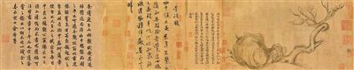 苏轼曾论述绘画中的“常理与常形”,把竹石枯木的物理特征与生动活泼的生命情感有机地结合在一起,形象地说明了“得其理者”,合于“达士之所寓”。这件《木石图》与《偃松图》恰好形成了画理与画趣上的对应关系。但相较后者,《木石图》有可能是最接近苏轼原作的一件存疑的作品。画上没有苏轼的题款与钤印,只能通过题材风格来推断此为坡翁作品。虽有卷后刘良佐的大段题跋,但此人的身份在史上没有考证,而另一段米芾的跋文,其真伪更存在巨大的争议性。