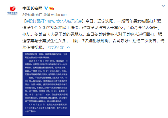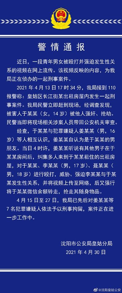 今日,辽宁沈阳,一段青年男女被殴打并强迫发生性关系的视频在网上流传。经查发现被害人于某(女,14岁)被他人强奸、抢劫。姜某自认为是于某的男朋友。当日姜某纠集多人对于某等人进行殴打、强迫李某与于某发生性关系。目前,7名嫌犯被刑拘。