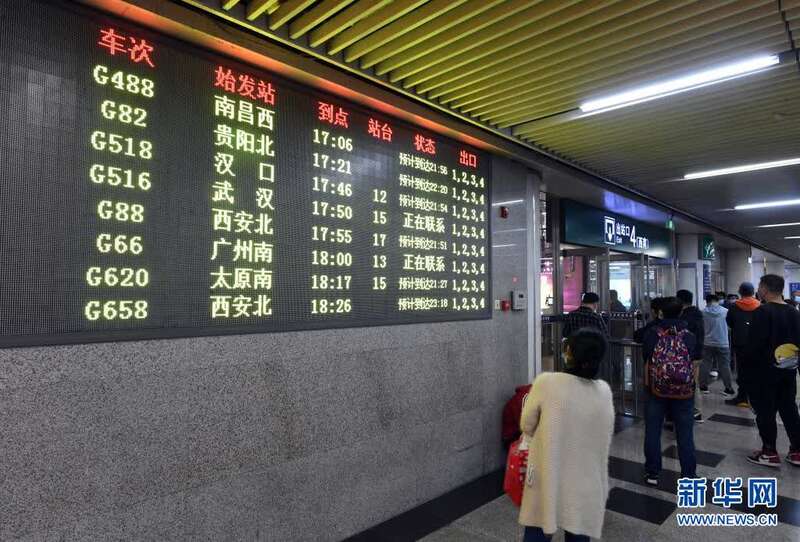 5月1日拍摄的北京西站南出站口显示晚点列车信息的显示屏。