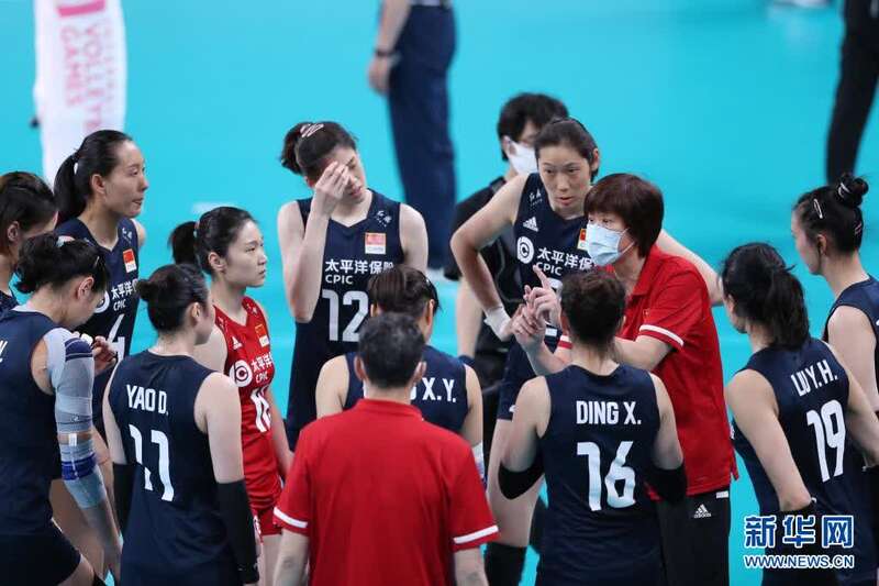 5月1日,中国女排主教练郎平(右三)在赛前指导球员。
