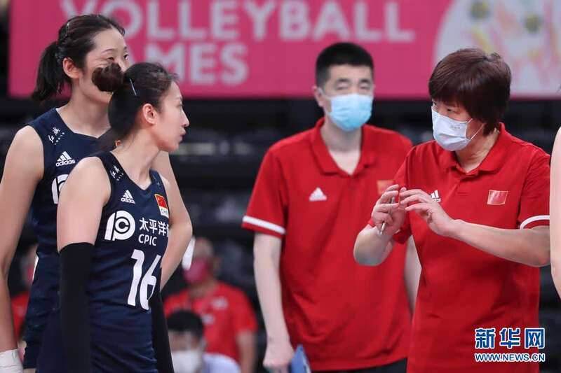 5月1日,中国队主教练郎平(右一)在比赛间隙指导球员丁霞(左二)。