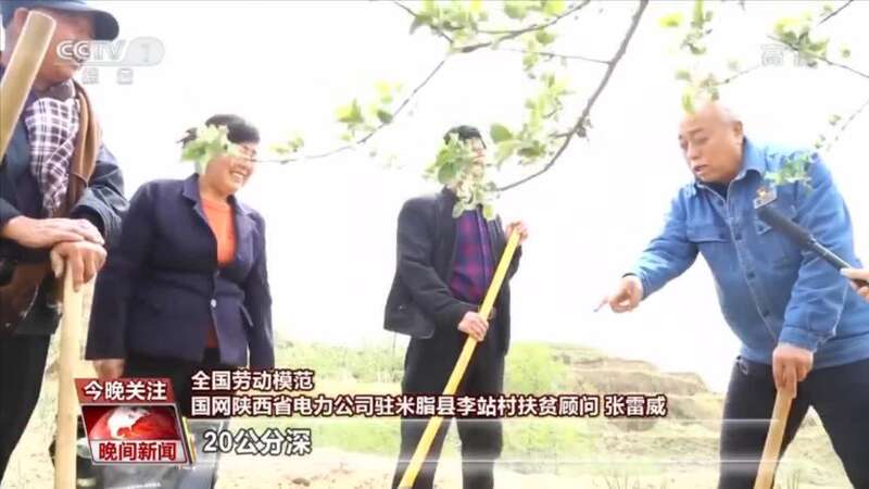 全国劳动模范 国网陕西省电力公司驻米脂县李站村扶贫顾问 张雷威:按树冠的大小,20公分深,20公分宽,一亩地施两袋肥,一棵树不得低于三斤(富硒肥),肥施过后再把土覆盖上,就把富硒肥长到果树里边去了,听明白了没有?