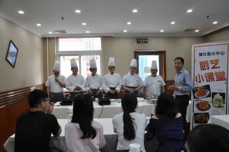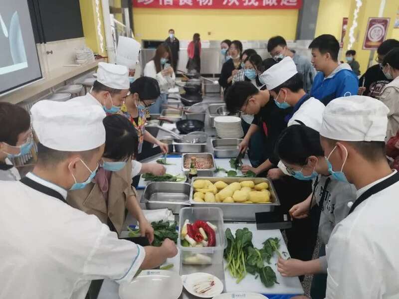 餐饮服务中心的厨师长从厨师变成“老师”,教同学们制作菜品佳肴。