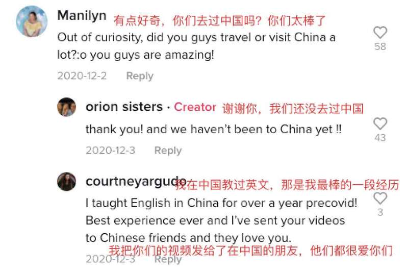 和很多美国年轻人一样,三姐妹的视频最初主打音乐和搞笑类视频。直到有一天,三人在TikTok上传了一条短视频,首次展示自己的中文功底。这条内容引发众多网友关注,播放量超过180万,获赞超过27万。