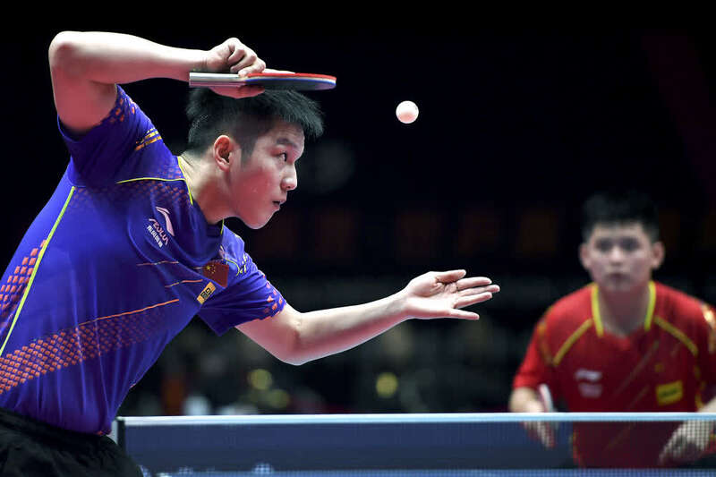 5月5日,樊振东(左)在比赛中发球。新华社记者李安摄