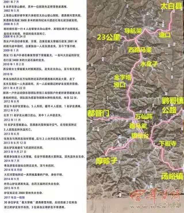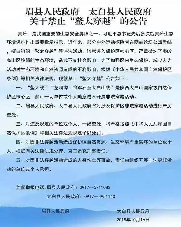 公开信息显示,“鳌太线”是纵贯秦岭鳌山与太白山的主山脉,太白山为秦岭山脉主峰,海拔3767米;鳌山是第二高峰,海拔3477米。两山之间的徒步穿越路线,是秦岭山脉最高的一段主脊,也被称为“中华龙脊”。多年来都曾有驴友因穿越“鳌太线”发生事故,2018年陕西眉县和太白县曾发布联合公告,全面禁止穿越“鳌太线”,但仍然有驴友前往以身试险。