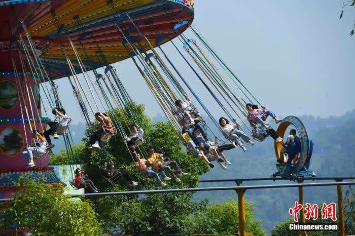 5月1日,“五一”节假的第一天, 重庆涪陵红酒小镇景区内的游客乘坐体验游乐设施。 中新社记者 陈超 摄