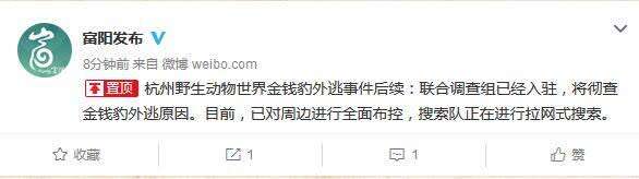 中新网5月8日电 据杭州市富阳区人民政府新闻办公室官方微博消息,针对杭州野生动物世界三只未成年金钱豹外逃事件,联合调查组已经入驻,将彻查金钱豹外逃原因。目前,已对周边进行全面布控,搜索队正在进行拉网式搜索。