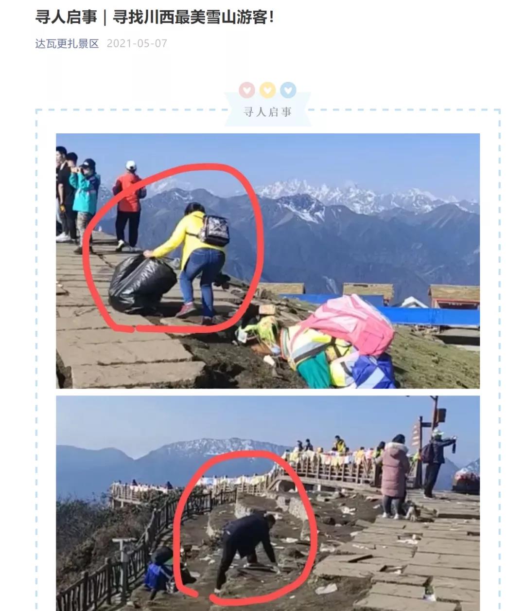 被找寻者是2名普通游客。从景区发布的图片和视频中可以看到,他们一位是身穿黄色外套蓝色牛仔裤的女士,另一位是身穿深蓝色外套黑色长裤的男士,两人正在景区云顶弯腰拾取垃圾。