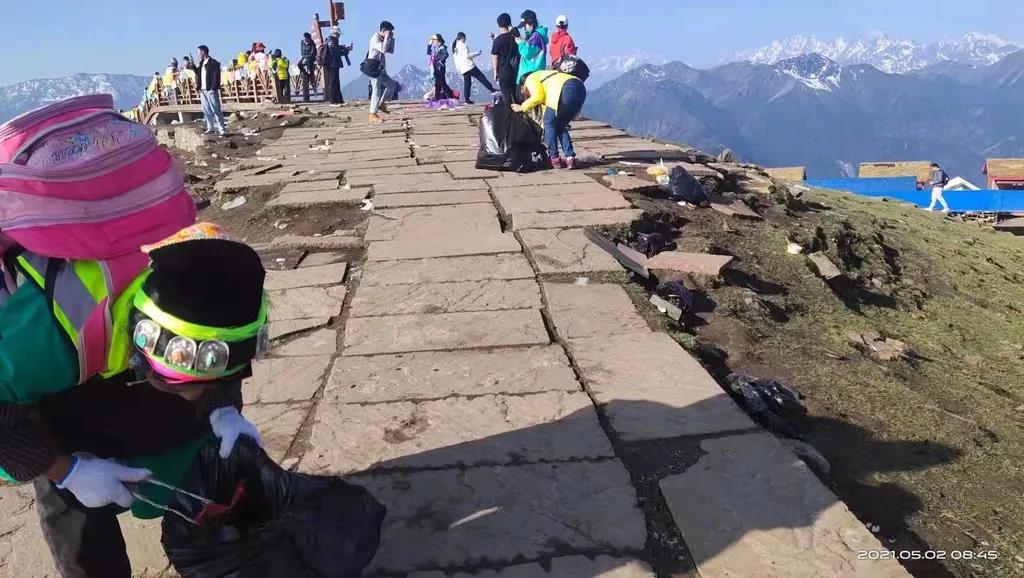 “由于人数较多,山顶气温较低,清晨又有不少露水,游客观看日出时使用的纸巾、塑料袋等忘记带走,现场留下了部分垃圾。”肯处说,“景区工作人员正在清理时,照片中的2名游客也主动帮忙。”一名正在取工作照的工作人员尔卡无意间拍下了他们的举动,并将照片分享至工作群。