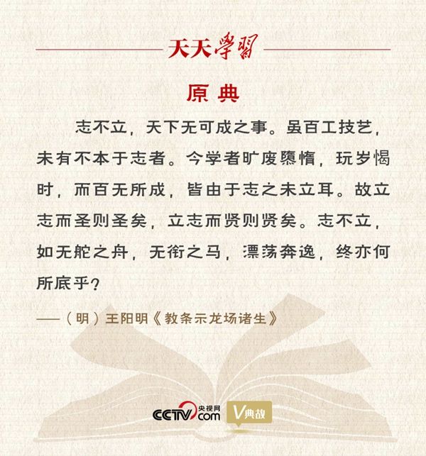 王阳明把“立志”作为为学的第一要义,指出“志不立,天下无可成之事”。他认为立志是成就事业的根本,“立志而圣则圣矣,立志而贤则贤矣” 。意思是说,立志成为圣人,就可以成为圣人;立志成为贤人,就可以成为贤人。反之,志向不树立,就像没有舵的船,没有嚼子的马一样,随水漂流,任意奔逃,终究达不到目标。