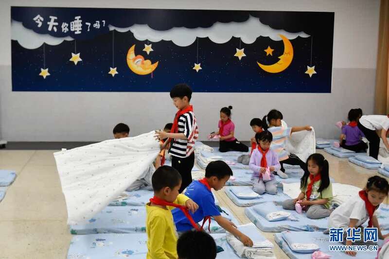 5月8日,杭州市永正实验学校一年级学生在午睡室准备午休。新华社记者 黄宗治 摄
