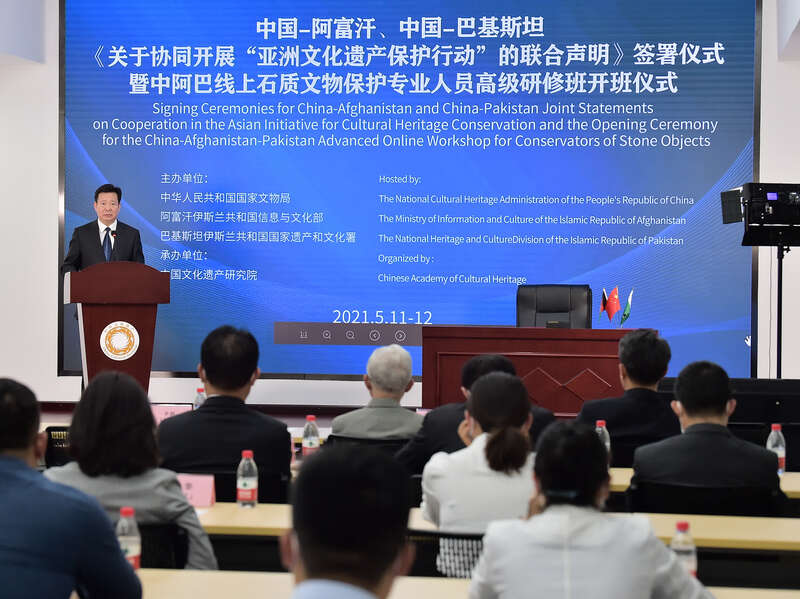 文化和旅游部副部长、国家文物局局长李群,阿富汗信息与文化部部长佐希尔,巴基斯坦国家遗产和文化署联合秘书长拉希姆在仪式上致辞并分别代表三国签署《联合声明》。国家文物局副局长胡冰作主旨演讲。