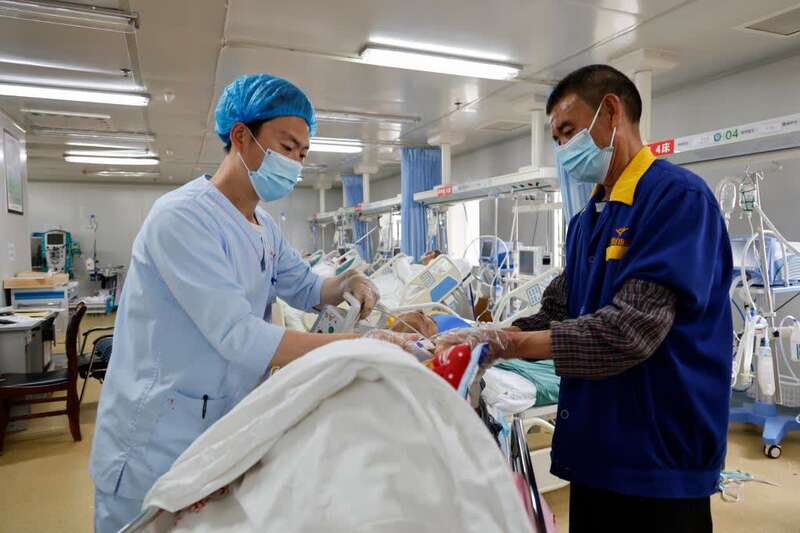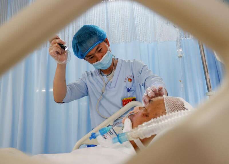 5月10日,在贵州省正安县人民医院重症医学科,邹星在为病人做检查。