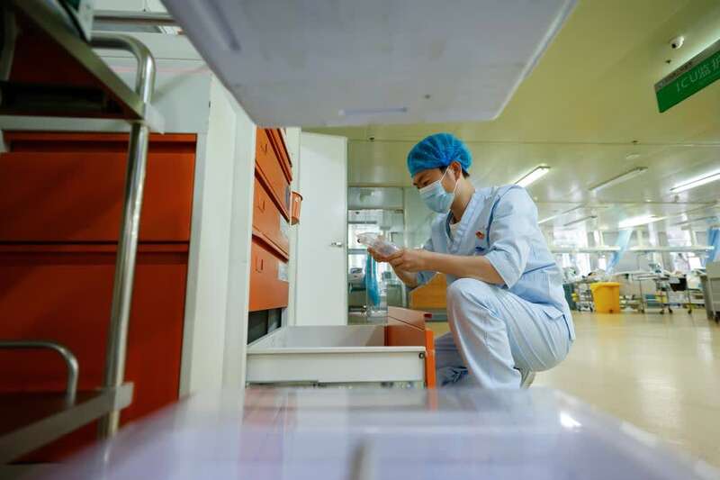 5月10日,在贵州省正安县人民医院重症医学科,邹星在放置药品。